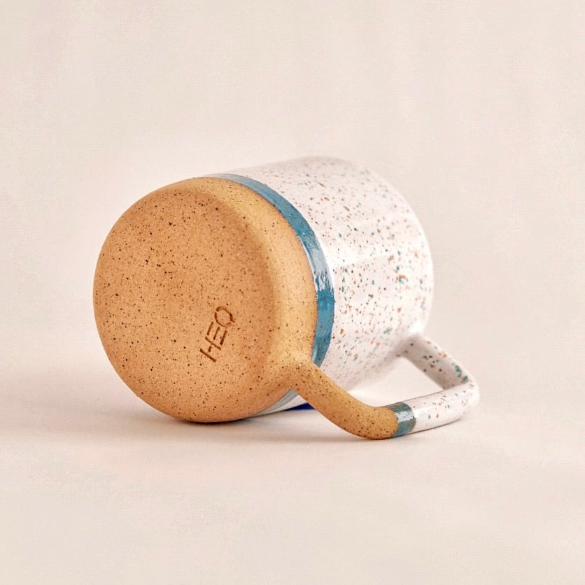 Your favorite birthday tumbler is now in mug form! Glossy white glaze with blue and orange crystals married into the natural iron flecks of the raw clay outside.